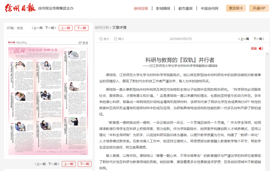 徐州日?qǐng)?bào)3月7日?qǐng)?bào)道我校化學(xué)與材料科學(xué)學(xué)院渠陸陸教授科研與教育事跡,報(bào)道內(nèi)容如下: