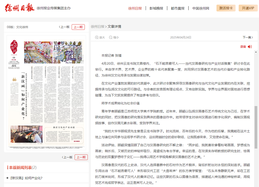 徐州日報4月24日報道我校與徐州市政府共建徐州云龍書院舉辦的當代漢畫像研究與產業對話雅集研討會,并采訪我校專家學者,報道內容如下: