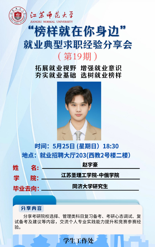 為增強學生就業意識,拓寬就業視野,夯實就業基礎,學生工作處結合學生關注度高、求職意愿強烈的行業領域,開展“榜樣就在你身邊”2025屆畢業生就業典型求職經驗分享系列活動,充分發揮朋輩榜樣的示范引領作用,幫助更多的學生提升就業競爭力。經學院推薦、學校遴選,現將第十九期活動開展相關情況通知如下:
