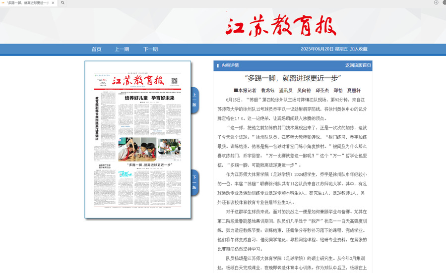 《江蘇教育報》、“江蘇教育發布”微信公眾號6月20日報道“蘇超”聯賽徐州隊12號球員、我校本科生喬宇的新聞,報道內容如下:
