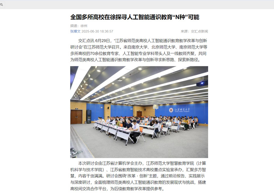 新華日報交匯點新聞6月30日報道江蘇省師范類高校人工智能通識教育教學改革與創新研討會在我校召開,報道內容如下: