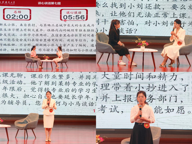 決賽分為真我風采、案例研討和談心談話三個環節。風采展示的舞臺上,結合自身特長,輔導員們以豐富的節目形式、富有感染力的表現,充分展現了學生工作隊伍良好的精神風貌。案例研討環節選手們相互提問,共同剖析問題、總結規律,展示了青年輔導員過硬的思想政治教育水平和深厚的政治理論素養;談心談話環節選手們面對棘手問題,迅速找準癥結、耐心疏導,詮釋了新時代教育工作者“以生為本”“立德樹人”的責任和情懷。經過激烈角逐,姚崢嶸、余永芳、汪滿莎、符靖璇、胡思雨等5位老師獲得一等獎;侯秀杰、鮑春曉、劉星君、楊曉童、魏麟欣、戴笑笑、張帆帆、劉夢、陳建福等9位老師獲得二等獎;鹿璐、王亦男、崔沁宇、趙彤、沈曉強、夏浩、李京展、陳碧燕、房天宇、趙寧、王藝璇、李雨晴、戴冠、代鑫等14位老師獲得三等獎。