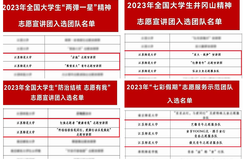 機(jī)電工程學(xué)院“啟航”志愿宣講團(tuán)、電氣工程及自動(dòng)化學(xué)院“聚螢星火”青年志愿宣講團(tuán)入選全國大學(xué)生“兩彈一星”精神志愿宣講團(tuán);教育科學(xué)學(xué)院“星火·筑夢”宣講團(tuán)、語言科學(xué)與藝術(shù)學(xué)院“紅磐青年”志愿宣講團(tuán)、法學(xué)院弘法立身志愿服務(wù)隊(duì)入選全國大學(xué)生井岡山精神志愿宣講團(tuán);生命科學(xué)學(xué)院紅燭志愿者“健康有我”志愿宣講團(tuán)、商學(xué)院“終結(jié)結(jié)核你我同行,愛肺行動(dòng)從我做起”志愿宣講團(tuán)入選全國大學(xué)生“防治結(jié)核志愿有我”志愿宣講團(tuán);音樂學(xué)院藝馨青年志愿服務(wù)隊(duì)、商學(xué)院“童享YOUNG光·攜手童行”青春志愿服務(wù)隊(duì)、中俄學(xué)院微光青年志愿者服務(wù)隊(duì)入選全國“七彩假期”志愿服務(wù)示范團(tuán)隊(duì)。