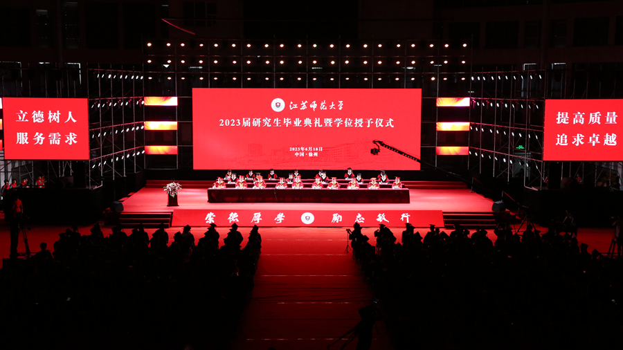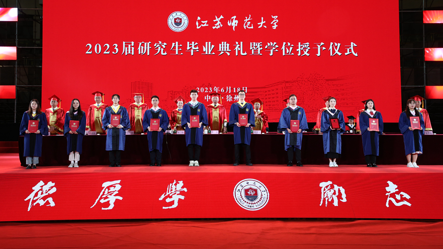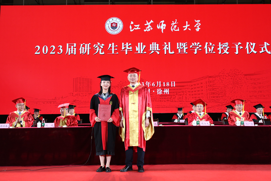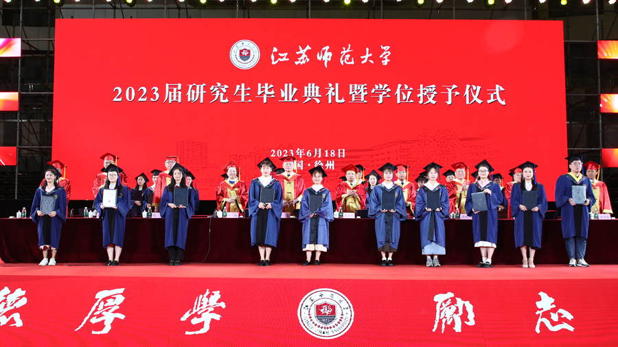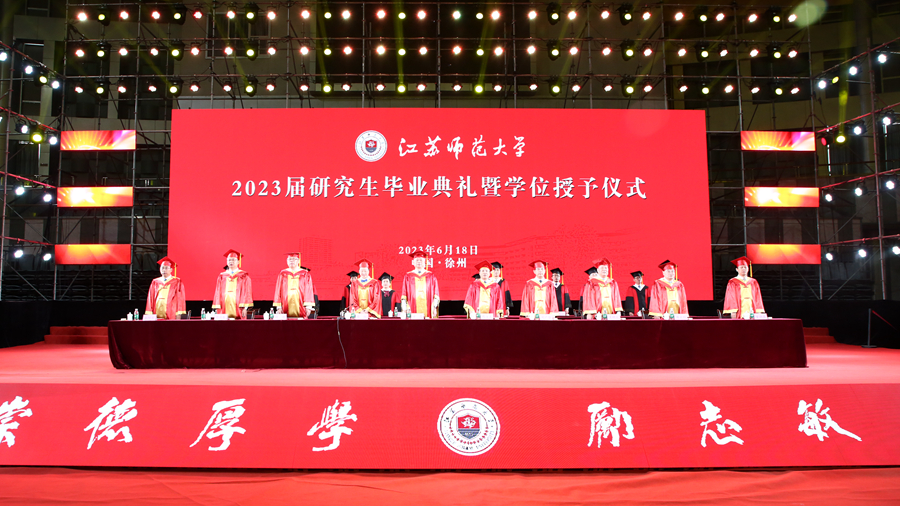 6月18日上午,江蘇師范大學(xué)2023屆研究生畢業(yè)典禮暨學(xué)位授予儀式在泉山校區(qū)體育館隆重舉行。全體校領(lǐng)導(dǎo)出席典禮,校學(xué)位評(píng)定委員會(huì)委員、承擔(dān)研究生培養(yǎng)任務(wù)的各學(xué)院領(lǐng)導(dǎo)、研究生導(dǎo)師代表、2023屆全體畢業(yè)研究生、往屆畢業(yè)研究生代表、研究生親屬代表、非畢業(yè)年級(jí)研究生代表參加典禮。校黨委副書記岑紅主持典禮。