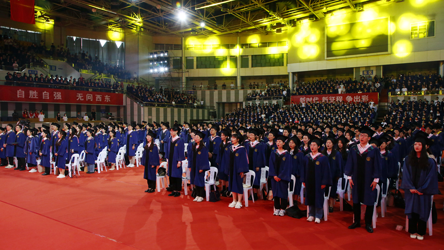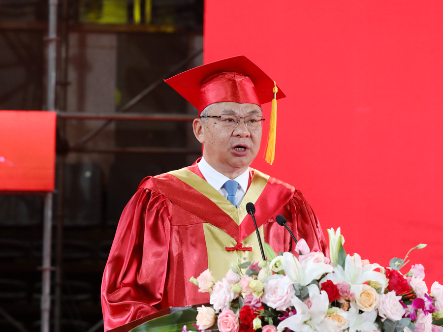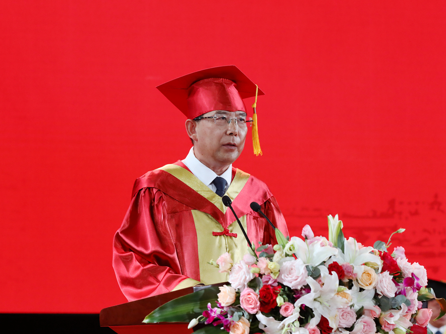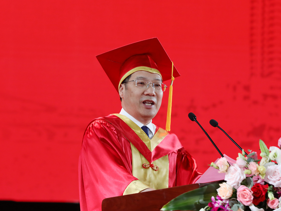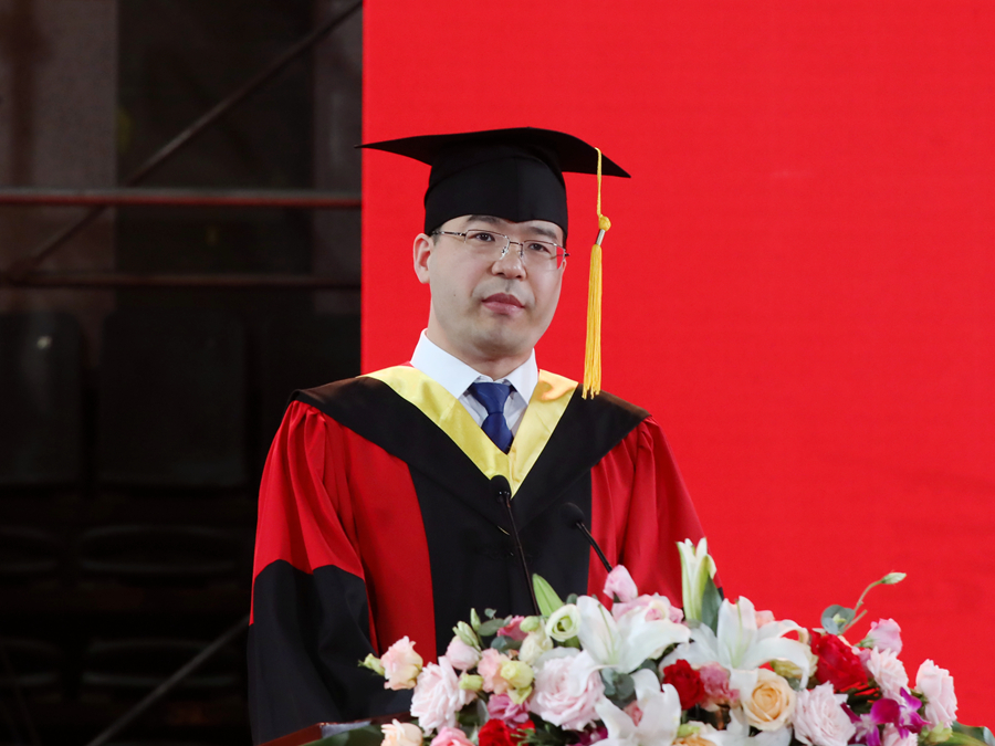 伴隨著莊嚴(yán)的國歌聲,畢業(yè)典禮正式開幕。校長、校學(xué)位評(píng)定委員會(huì)主席周汝光在典禮上致辭,代表學(xué)校向圓滿完成學(xué)業(yè)的畢業(yè)生們表示熱烈祝賀,向辛勤培育、陪伴支持畢業(yè)生的老師和家長致以衷心感謝。周汝光以“擦亮青春底色,唱響時(shí)代之音”為題,飽含深情地回顧了全體畢業(yè)研究生在讀期間取得的成績,充分肯定了大家在疫情防控期間與學(xué)校息息相通,甘苦與共,用實(shí)際行動(dòng)關(guān)注支持學(xué)校事業(yè)發(fā)展作出的努力。他寄語全體畢業(yè)研究生,生逢偉大時(shí)代,不僅要學(xué)有所成,更要學(xué)有所思、學(xué)有所用,做持之以恒的自律者、堅(jiān)韌不拔的奮斗者、矢志不渝的愛國者。周汝光勉勵(lì)全體畢業(yè)研究生要傳承好“崇德厚學(xué),勵(lì)志敏行”的校訓(xùn),心中有陽光,腳下有力量,篤行致遠(yuǎn)、惟實(shí)勵(lì)新,不墜青云之志,創(chuàng)造無愧于時(shí)代的精彩人生。