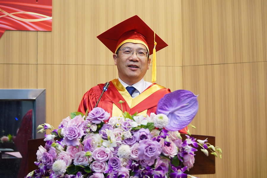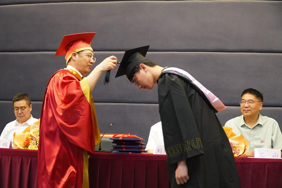 周汝光為2023屆畢業(yè)生代表頒發(fā)畢業(yè)證書、授予學士學位,之后發(fā)表了熱情洋溢的講話。他對畢業(yè)生同學在世界變局之際、疫情沖擊之下勇?lián)厝危趭^篤學,茁壯成長給予了充分肯定,并對全體畢業(yè)生提出了三點期待:一是心存青云志,始終胸懷“國之大者”;二是身持行動令,始終堅持“學思踐悟”;三是永葆卓越心,始終相信“時代和未來”。他祝愿全體2023屆敬文學子前程似錦繡,再創(chuàng)新輝煌。