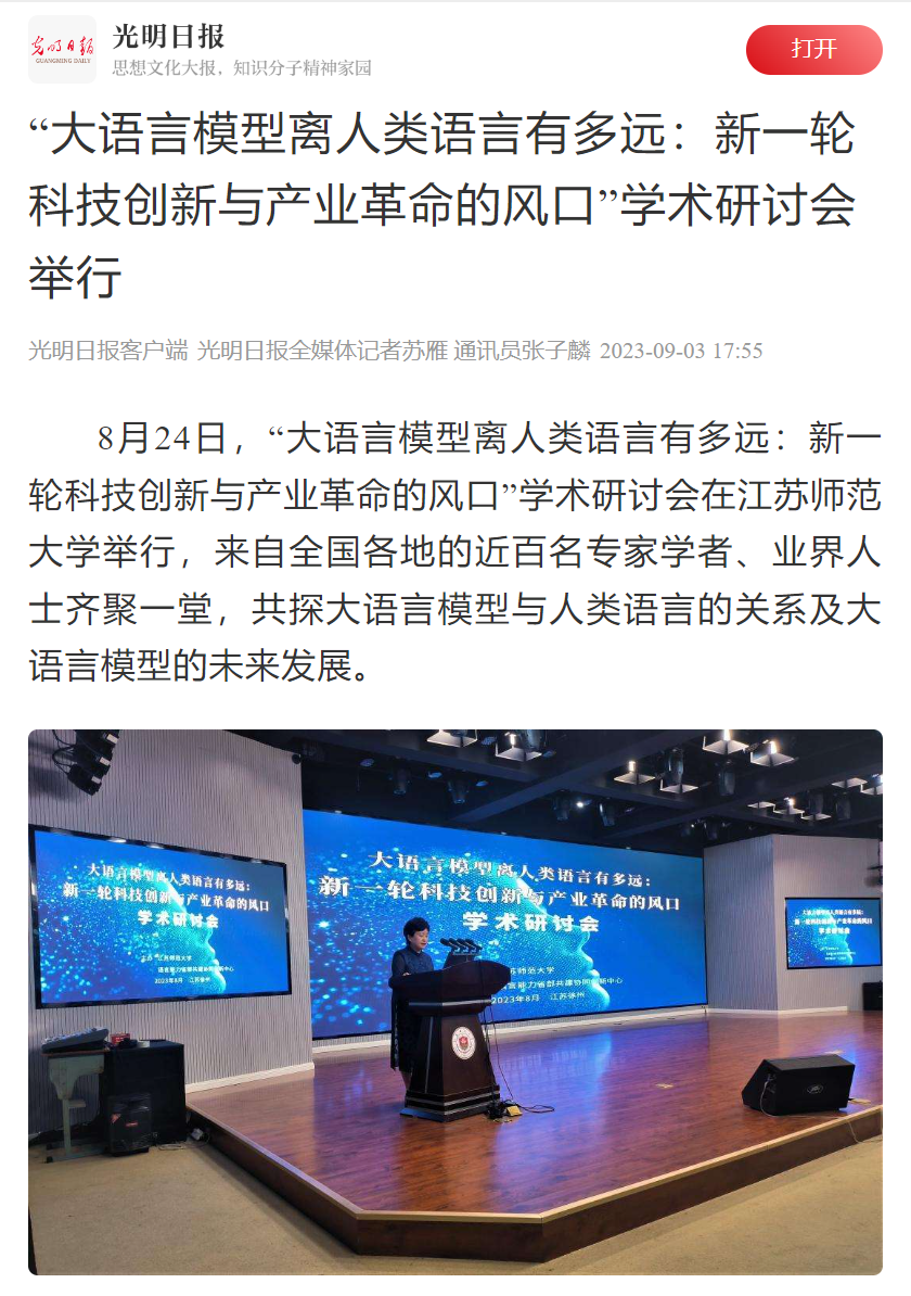 光明日報客戶端9月3日報道我校舉行的“大語言模型離人類語言有多遠:新一輪科技創新與產業革命的風口”學術研討會,報道內容如下: