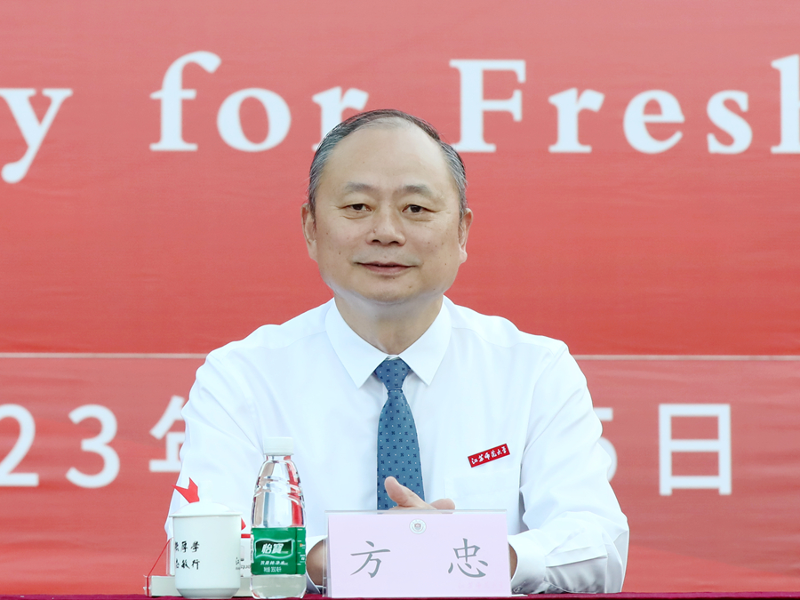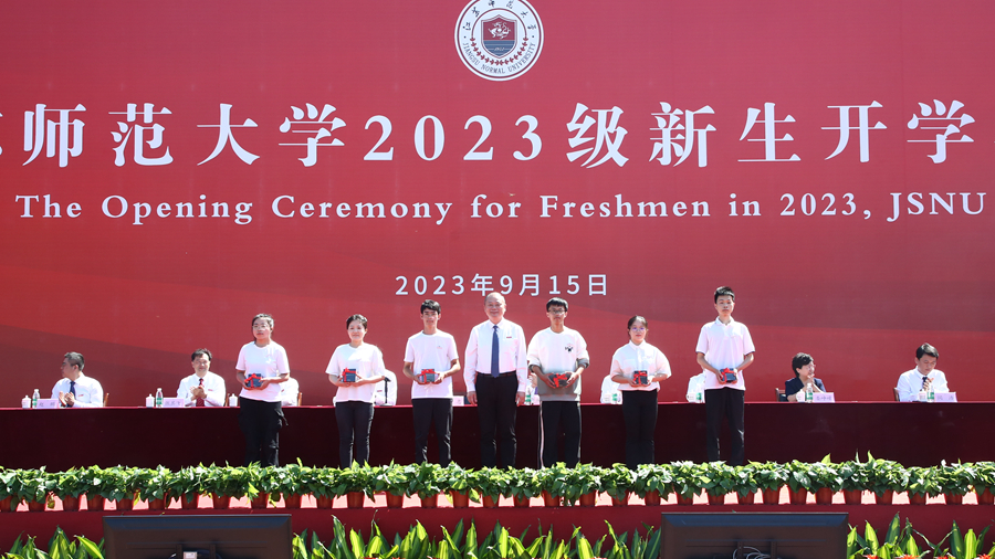 2023級學生中,有很多杰出代表,其中包括了少數民族、青海師大來校交流、研究生入學考試單科最高分同學,今年因抗洪救災,在部隊立功受獎的同學。正是由千千萬萬不同地區、不同境遇的學子,組成了江蘇師范大學這樣一個溫暖的大家庭。副校長杜增吉代表學校向優秀新生代表贈送了開學禮物。