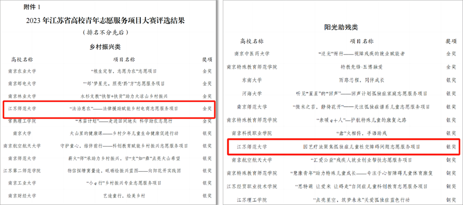 近日,2023年江蘇省高校青年志愿服務(wù)項(xiàng)目大賽暨高校青年志愿服務(wù)研討活動(dòng)在南京郵電大學(xué)舉辦。本屆大賽全省共有84所高校245個(gè)項(xiàng)目參賽,150個(gè)項(xiàng)目進(jìn)入路演答辯環(huán)節(jié)。經(jīng)專家評(píng)審,法學(xué)院張春艷、張杰老師指導(dǎo)的《“法治惠農(nóng)”——法律援助賦能鄉(xiāng)村電商志愿服務(wù)項(xiàng)目》榮獲鄉(xiāng)村振興組金獎(jiǎng),生命科學(xué)學(xué)院方如萍、張巖行老師指導(dǎo)的《“園藝療法”聚焦孤獨(dú)癥兒童社交障礙問題志愿服務(wù)項(xiàng)目》榮獲陽光助殘組銀獎(jiǎng)。大賽期間,我校作為代表高校在“志愿服務(wù)助力鄉(xiāng)村振興”研討活動(dòng)中發(fā)言。