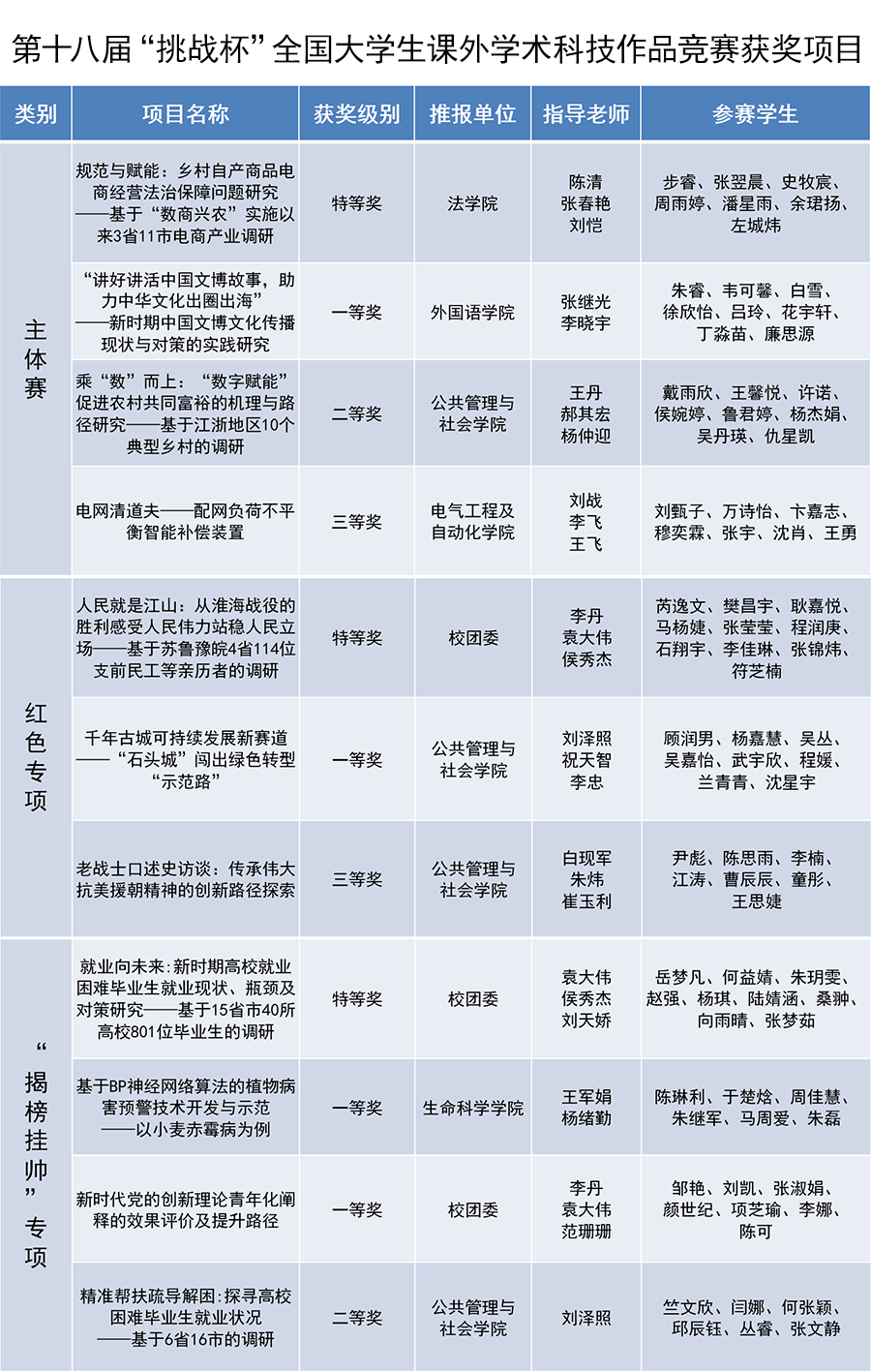 在主體賽中,《規范與賦能:鄉村自產商品電商經營法治保障問題研究——基于“數商興農”實施以來3省11市電商產業調研》榮獲特等獎,《“講好講活中國文博故事,助力中華文化出圈出海”——新時期中國文博文化傳播現狀與對策的實踐研究》榮獲一等獎,《乘“數”而上:“數字賦能”促進農村共同富裕的機理與路徑研究——基于江浙地區10個典型鄉村的調研》榮獲二等獎,《電網清道夫——配網負荷不平衡智能補償裝置》榮獲三等獎;紅色專項賽中,《人民就是江山:從淮海戰役的勝利感受人民偉力站穩人民立場——基于蘇魯豫皖4省114位支前民工等親歷者的調研》榮獲特等獎,《千年古城可持續發展新賽道——“石頭城”闖出綠色轉型“示范路”》榮獲一等獎,《老戰士口述史訪談:傳承偉大抗美援朝精神的創新路徑探索》榮獲三等獎;“揭榜掛帥”專項賽中,《就業向未來:新時期高校就業困難畢業生就業現狀、瓶頸及對策研究——基于15省市40所高校801位畢業生的調研》榮獲特等獎,《新時代黨的創新理論青年化闡釋的效果評價及提升路徑》榮獲一等獎,《基于BP神經網絡算法的植物病害預警技術開發與示范——以小麥赤霉病為例》榮獲一等獎,《精準幫扶疏導解困:探尋高校困難畢業生就業狀況——基于6省16市的調研》榮獲二等獎。