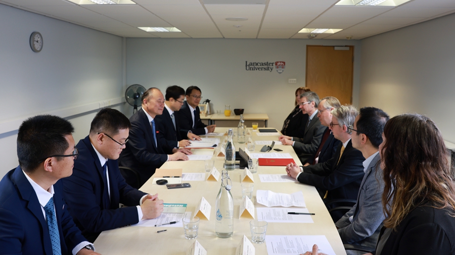 在英國訪問期間,訪問團首先來到英國蘭卡斯特大學,與西蒙?蓋常務副校長圍繞兩校翻譯碩士聯合培養項目進行了會談。方忠簡要介紹了我校的歷史沿革和發展近況,尤其是我校翻譯碩士專業授權點的師資和人才培養質量情況,并表示兩校翻譯碩士聯合培養項目有助于提升我校翻譯碩士培養質量,促進英語能力和翻譯技能發展。西蒙?蓋常務副校長對方書記一行表示熱烈歡迎,并表示希望在翻譯碩士學位點建立長期穩定且成功的合作。