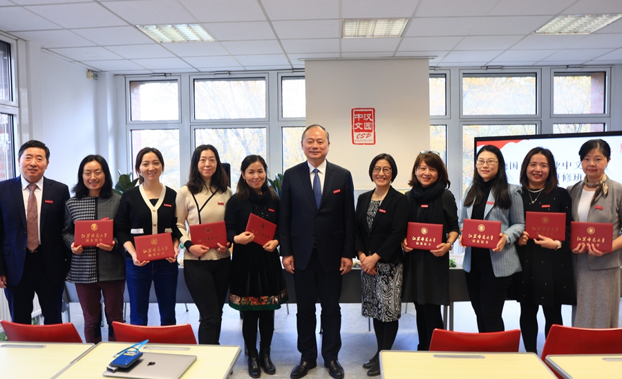 訪問期間,江蘇師范大學和漢園中文學校共同舉行了德國首屆專業中文教師高級別研修班結業典禮。方忠為20位學員頒發了結業證書并佩戴校徽,向他們的順利畢業表示祝賀,同時表示江蘇師范大學永遠都是校友的堅強后盾,期望大家在德國工作順利,努力為歐洲華文教育貢獻力量。最后,江蘇師范大學成立歐洲校友會籌備組,校友會總部設在德國漢園中文學校,聘任王杰為歐洲校友會籌備組主任,方忠對王杰校長在校友會籌備工作的辛苦付出表示感謝,并希望歐洲校友會能盡快完成籌備,并發揮作用。