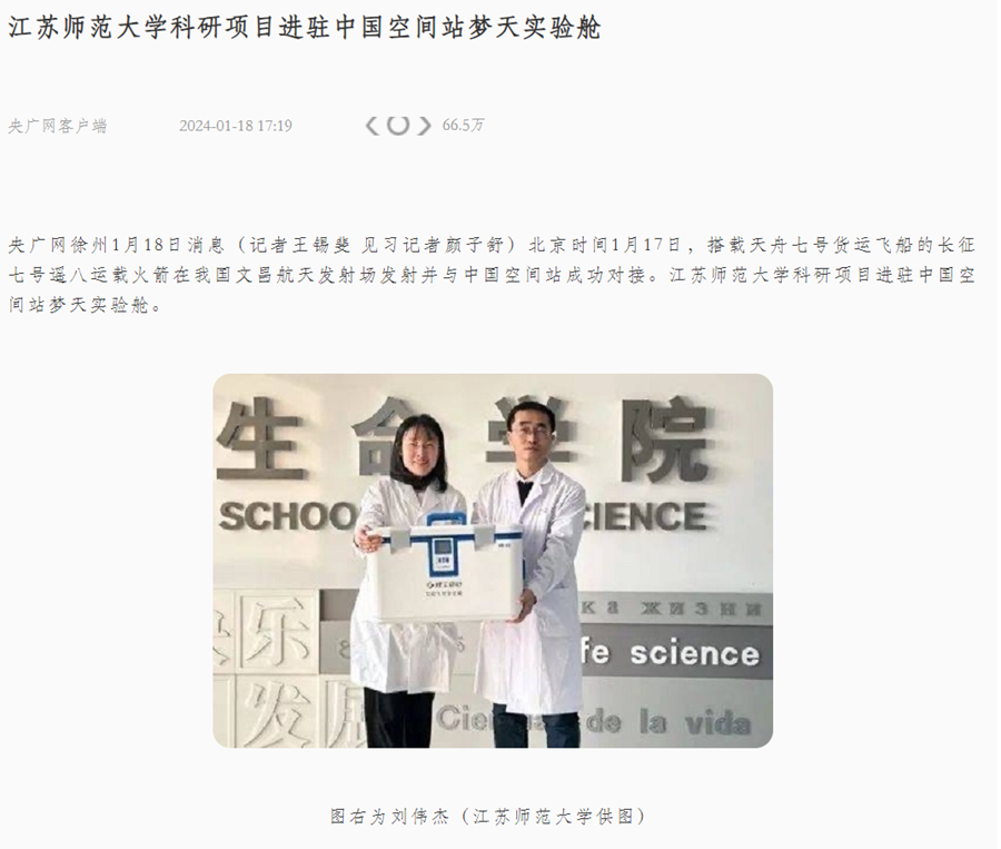 1月19日央廣網報道我校劉偉杰教授團隊研究成果入駐空間站,報道內容如下: