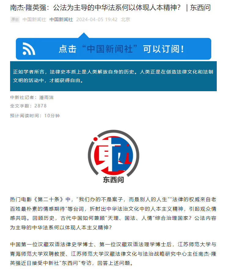 中國第一位漢藏雙語法律史學博士、第一位漢藏雙語法理學博士后,江蘇師范大學與青海師范大學雙聘教授、江蘇師范大學漢藏法律文化與法治戰略研究中心主任南杰·隆英強近日接受中新社“東西問”專訪,回答上述問題。