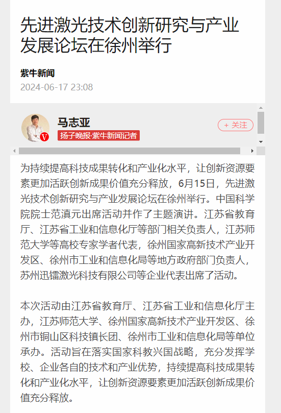 先進激光技術創新研究與產業發展論壇在徐州舉行