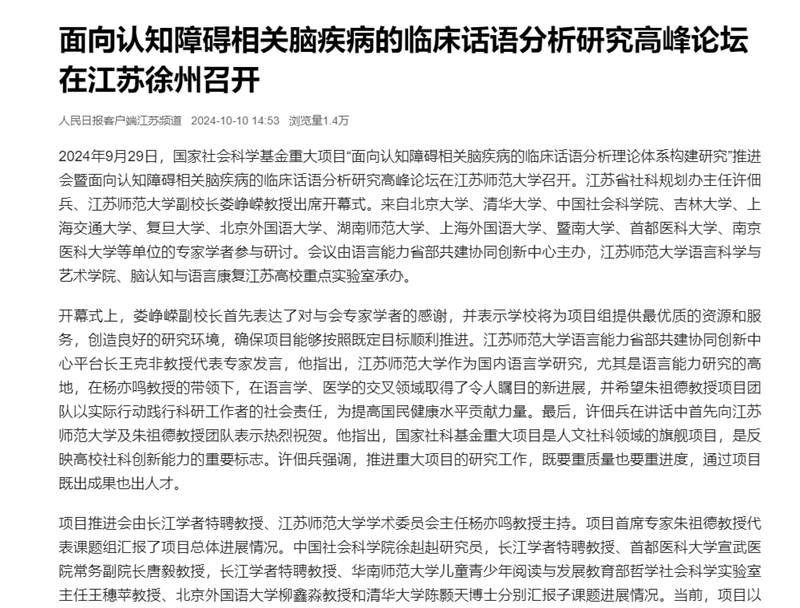 人民日報客戶端10月10日報道我校舉辦的面向認知障礙相關腦疾病的臨床話語分析研究高峰論壇,報道內容如下: