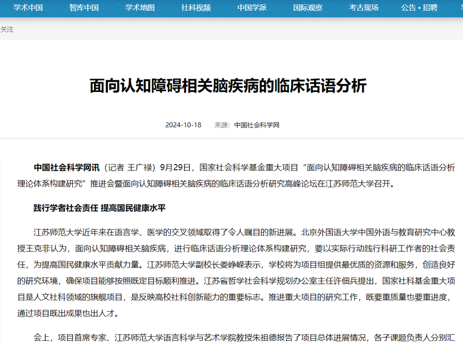 中國(guó)社會(huì)科學(xué)網(wǎng)10月18日?qǐng)?bào)道我校舉辦的“面向認(rèn)知障礙相關(guān)腦疾病的臨床話語(yǔ)分析理論體系構(gòu)建研究”推進(jìn)會(huì)暨面向認(rèn)知障礙相關(guān)腦疾病的臨床話語(yǔ)分析研究高峰論壇,報(bào)道內(nèi)容如下: