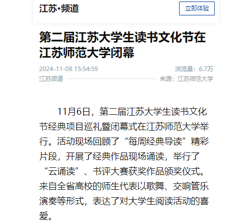 新華社客戶端11月8日報道在我校舉辦的第二屆江蘇大學生讀書文化節經典項目巡禮暨閉幕式,報道內容如下: