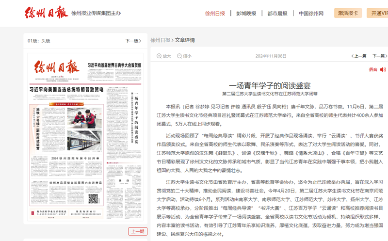徐州日?qǐng)?bào)11月8日頭版報(bào)道在我校舉行的第二屆江蘇大學(xué)生讀書文化節(jié)經(jīng)典項(xiàng)目巡禮暨閉幕式,報(bào)道內(nèi)容如下: