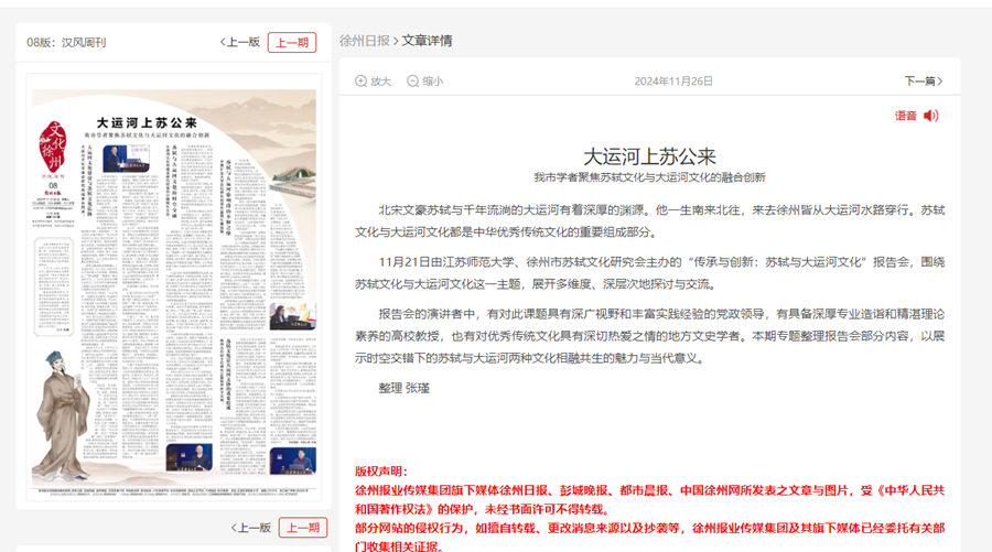 徐州日?qǐng)?bào)11月26日第八版,整版報(bào)道在我校舉辦的蘇軾文化與大運(yùn)河文化研討會(huì),報(bào)道內(nèi)容如下:
