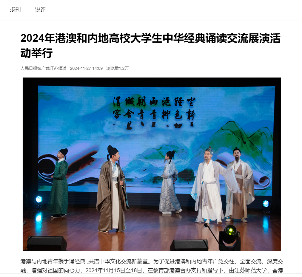 人民日報客戶端報道我校語言科學(xué)與藝術(shù)學(xué)院與港澳高校聯(lián)合舉辦中華經(jīng)典誦讀活動,報道內(nèi)容如下: